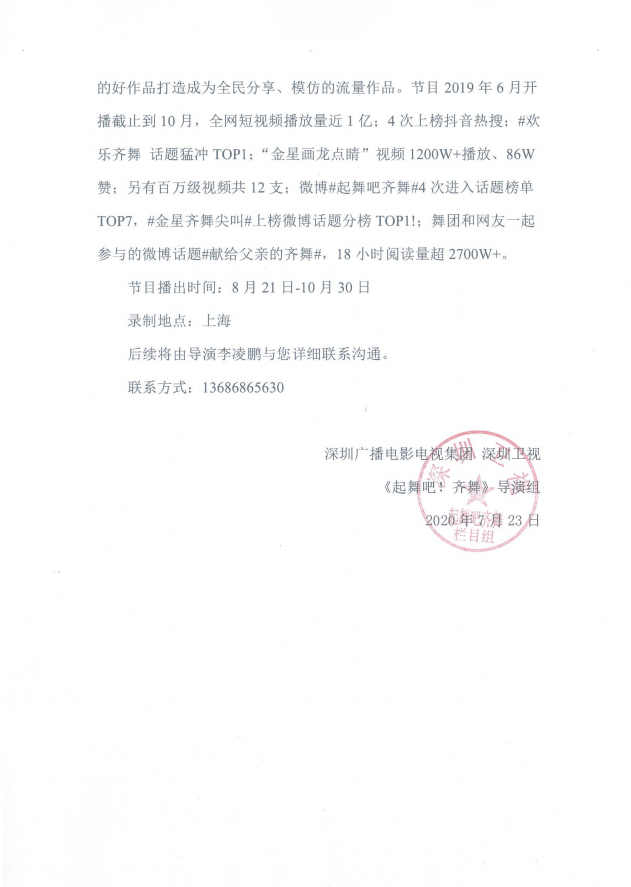 好消息!好消息!我院青年教师王佳楠受深圳广播电影电视集团邀请,参加深圳卫视大型舞蹈节目《起舞吧,齐舞!》第二季节目录制啦!